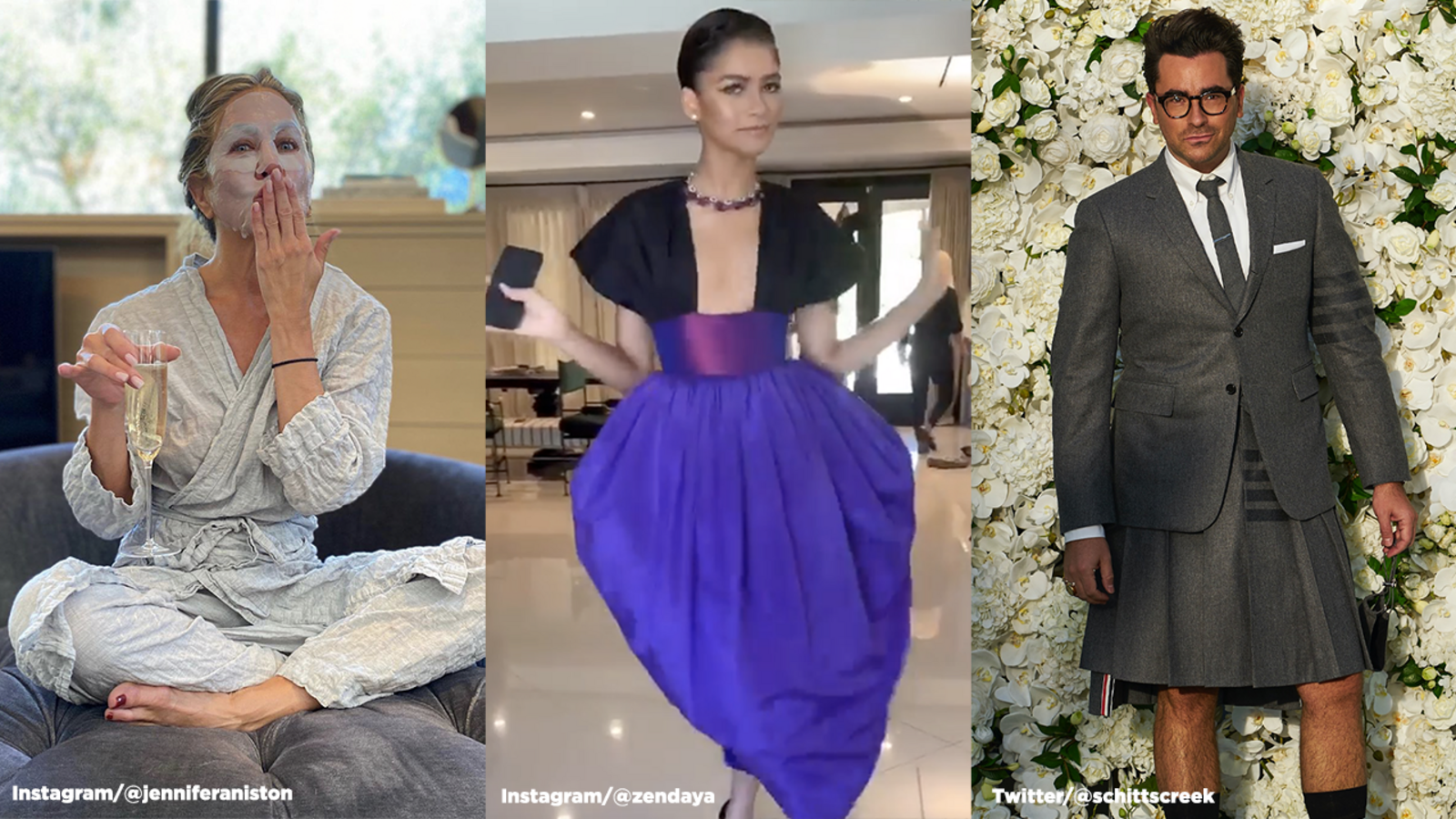 Jennifer Aniston saved her look for primetime, wearing a full-length black dress. The "Morning Show" actress posted a photo of herself earlier in a robe and face mask, relaxing with a flute of champagne.